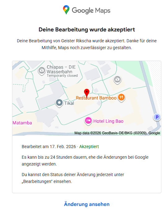 Da kennt sich aber jemand aus... also lass das bitte. 😂 Edit: Da hat sich jemand mehr als nur einen kleinen Spaß erlaubt: Colorado Adventure ist jetzt nach China umgesiedelt. F.L.Y. Törtchen und Co sowie der Feng Ju Palace drehen jetzt ihre Runden auf dem Dach von Crazy Bats. 😂 Edit: Ich war so frei und habe die Standortdaten auf die richtigen Positionen zurück geändert. Normalerweise kann man als Inhaber der Geschäfte sich bei Google diese auch übertragen lassen. Damit schließt man dann wahlloses Hin- und Herschieben von Spaßvögeln aus. Nur mal so als Tipp, der Park liest ja hier gerne mit.😅 PS: Die Standortänderung der Rikscha auf den richtigen Standort ist bereits abgeschlossen, ich denke mal Colorado, F.L.Y. , Törtchen & Co sowie Feng Ju Palace werden dann zeitnah folgen: Falls es jemanden interessiert, wird also Zeitnah wieder alles dahin wandern, wo es hingehört. 😉