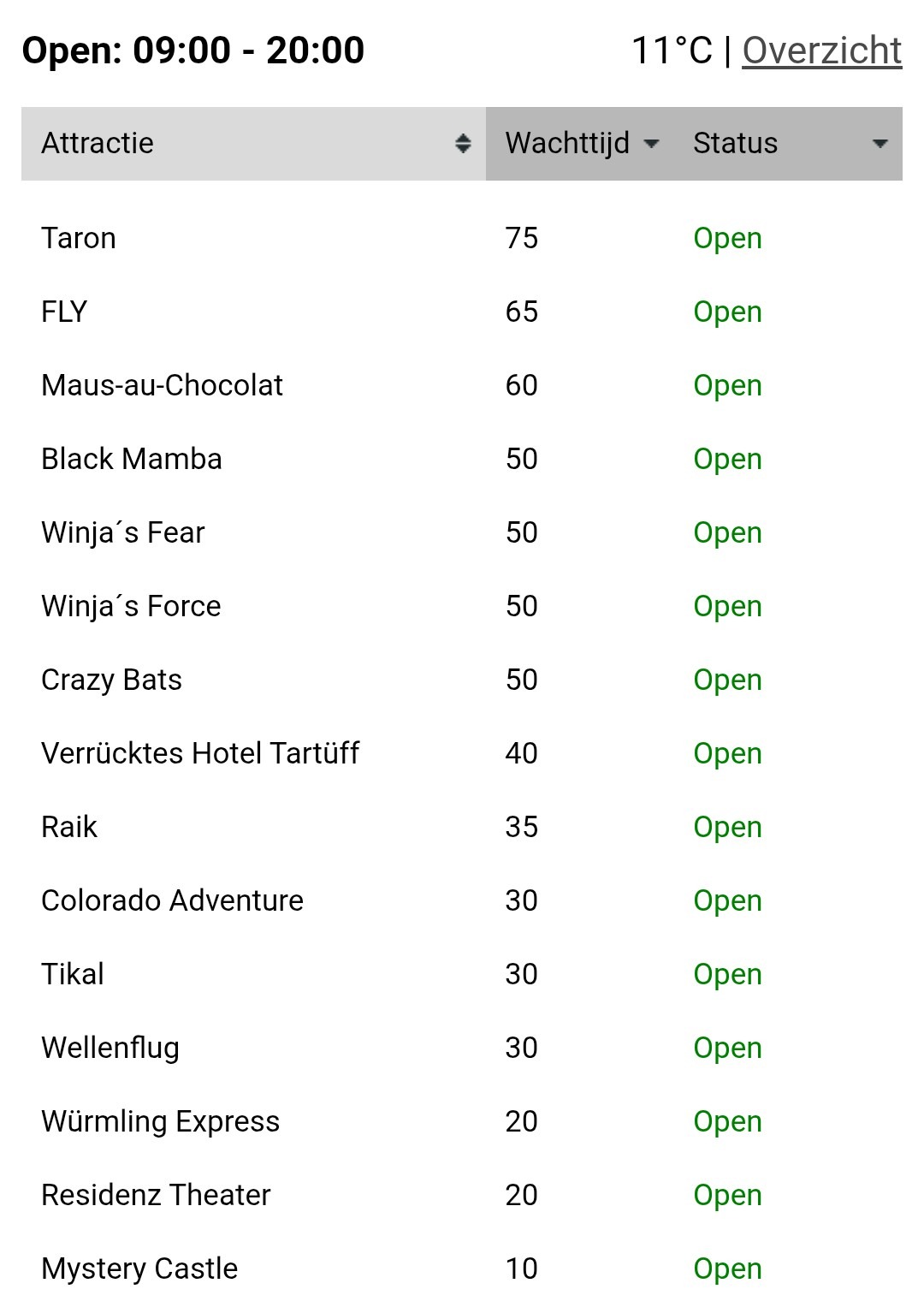 Ich bin heute (zum Glück) nicht im Park, aber das ist ja einer der wenigen Tage gewesen die in letzter Zeit auf 78€ Vollpreis angeklettert sind. Und das spiegelt sich definitiv in den vom Park angegebenen wartezeiten wieder. Wie es in der Realität aussieht, kann ich natürlich nicht sagen, aber das sieht nach dem bisher vollsten Tag des Wintertraums aus. Quelle: Looopings.nl Dennoch: es gibt Attraktionen die man mit wenig Wartezeit fahren kann. Talocan und Mystery Castle sind mit 10 Minuten angegeben. Da fällt mir ein: Mystery Castle fährt diesen wintertraum scheinbar immer mit allen 6 Spuren. Das merkt man deutlich in der wartezeit. Hut ab an den Park, dafür dass das endlich funktioniert! Ich glaube auch die 30 Minuten bei der Colorado werden wieder überschätzt sein - da steht man fast immer nur die Hälfte der Zeit.