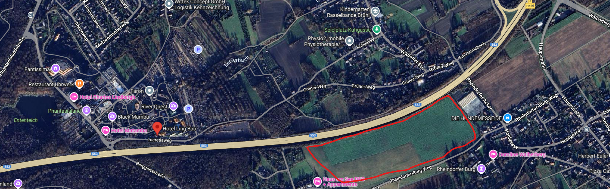 In Rust geht man aber auch an die Randbereiche ran. Für Voltron wurde eine Halle abgebaut (und wahrscheinlich woanders hingesetzt) und die Veranstaltungsfläche für Immer wieder Sonntags verlegt. Und für die geplante Erneuerung der Euro-Mir vermute ich mal, dass auf dem Gelände hinter der Bahn Gebäude entfernt werden, da nicht nur eine neue Achterbahn sondern auch weitere Fahrgeschäfte entstehen sollen und Russland zwar verkleinert aber ansonsten nicht verändert werden soll (Europa-Park greift zu den Sternen: Weltraum-Areal für 2028 geplant) . Hier wird vermutlich ab dem Platz vor der Euro-Mir der neue Weltraum-Bereich beginnen. Und da sich rechts direkt Kroatien und links unmittelbar Luxemburg und England anschließen, bleibt halt nur der Weg nach hinten. Gelände für die Verlagerung von Gebäuden scheint ja vorhanden zu sein, wenn man sich mal die Umgebung der neuen Werksfeuerwehr-Wache anschaut. In Brühl ist dieses Vorgehen aber leider eher schwer, da es um den Park sehr wenig freies Feld gibt. Ich habe mal auf Maps geschaut und eine Wiese in der Nähe gefunden, die evtl. als Parkplatz geeignet sein könnte: Die Zufahrt über die Abfahrt Brühl über eine eigene Straße und einen Fussweg unter der Autobahn hindurch am Busparkplatz entlang. Der Weg wäre zwar ein Stück weiter, aber ich finde noch machbar. Von der Größe her sollte die Fläche ähnlich der beiden Parkplätze sein. Die Frage wäre natürlich auch hier wieder, wie die Parkplatzbetreiber da mitspielen.