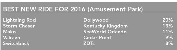 Über Geschmack kann man ja ewig streiten und zu keinem Ergebnis kommen... Was ich an den Golden Ticket Awards eher als seltsam empfunden habe ist die Liste der besten neuen Attraktionen für das Jahr 2016: Ich bin keine der Bahnen auf dieser Liste gefahren, um diese Liste irgendwie kritisieren zu können. Es ist irgendwie aber schon seltsam, dass hier Platz 3. (Mako (35)) hinter Taron (32) in den Top 50 der Stahlachterbahnen landet und Taron in der oben genannten Liste überhaupt nicht erwähnt wird. Valravn taucht in den Top 50 der besten Stahlachterbahnen übrigens gar nicht auf. Das Gleiche kann man ebenfalls bei einer anderen europäischen 2016 Neuheit - Wildfire - beobachten. Platz 5. (Switchback) taucht nicht in den Top 50 der Holzachterbahnen auf, während der europäische Neueinsteiger Wildfire gleich auf Platz 28. einsteigt. Wie zu Beginn bereits erwähnt lässt sich über Geschmack ja bekanntlich streiten, aber diese logische Unstimmigkeit gibt auch dem übrigen Ranking zumindest in meinen Augen einen komischen Beigeschmack.