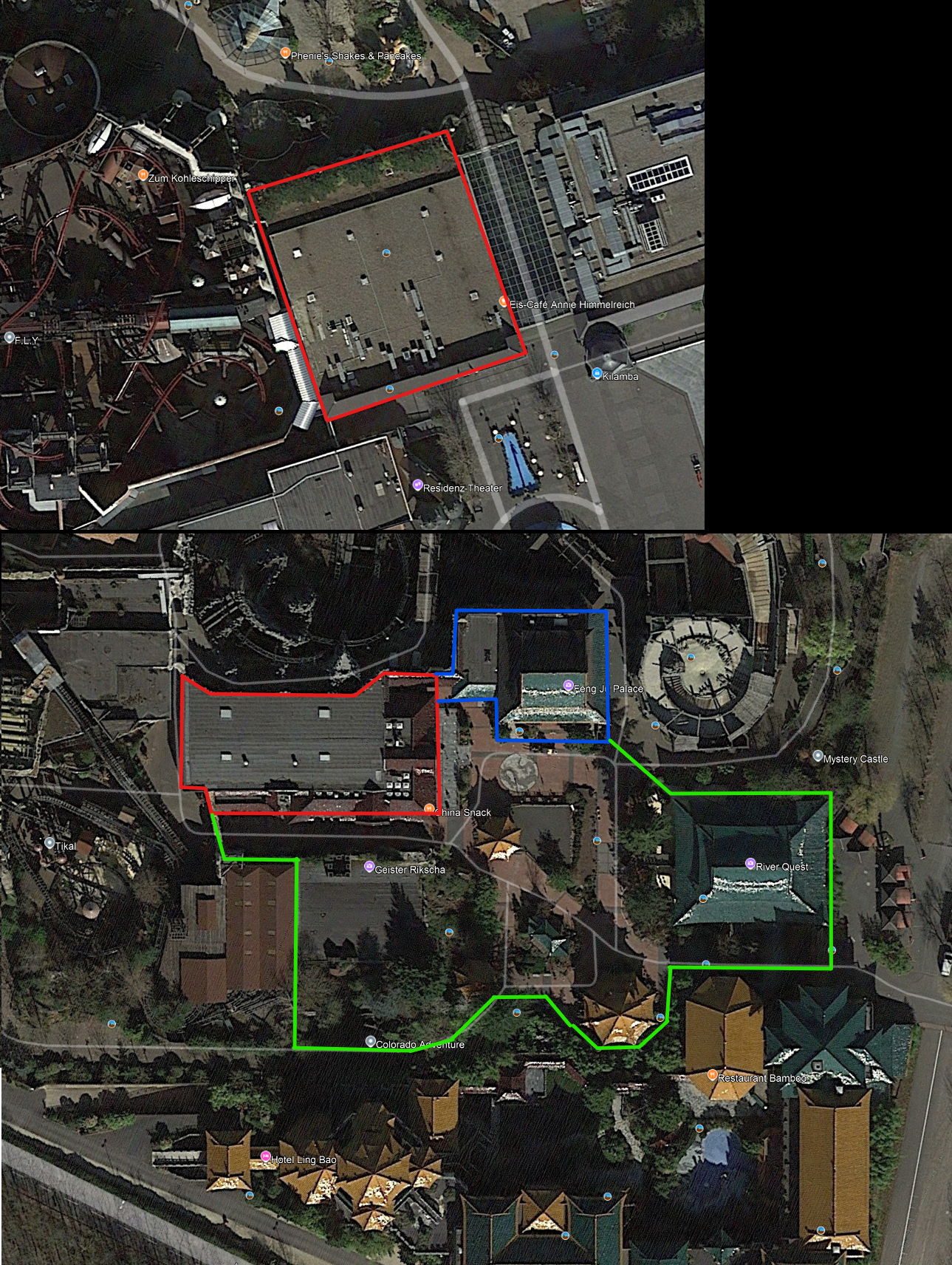Gerade da bräuchte der Park Attraktionen, die Ihre Kapazität auch nutzen. Wem nützt denn die riesen Kapazität der Geisterrikscha etwas, wenn die meisten Gondeln Leer Fahren. Dann würde es dem Park mehr helfen, wenn man eine große Neuheit hätte, die vielleicht weniger Kapazität hat, aber die Gäste von den Wegen holt und auch begeistert. Dann lieber 45 Wartezeit für eine Gute Attraktion, als 0 Minuten für eine in die Jahre gekommene Attraktion, die sehr leer ist. Ich möchte noch einmal aufzeichnen über was für eine Fläche wir hier sprechen. Das ist je nach Aufteilung riesig. Alleine Wenn man nur den Snack und die Restliche Silberminenhalle nimmt (Rot), ist das schon ein riesen Areal, das zurzeit nicht optimal genutzt ist. Nimmt man den Palace noch dazu, wird das ganze noch größer (Rot + Blau). Auch das Mandschu ist riesig. Zum Vergleich hab ich das mal in Relation zu Maus o Chocolat gesetzt. Grün wäre grob der Restliche Bereich inkl. Mandschu. Ich denke, wenn man mit dem bisherigen Stil diesen Bereich komplett neu machen würde, könnte man hier zumindest zwei große Attraktionen unter Bringen und hätte den Bereich genau so offen wie bisher.