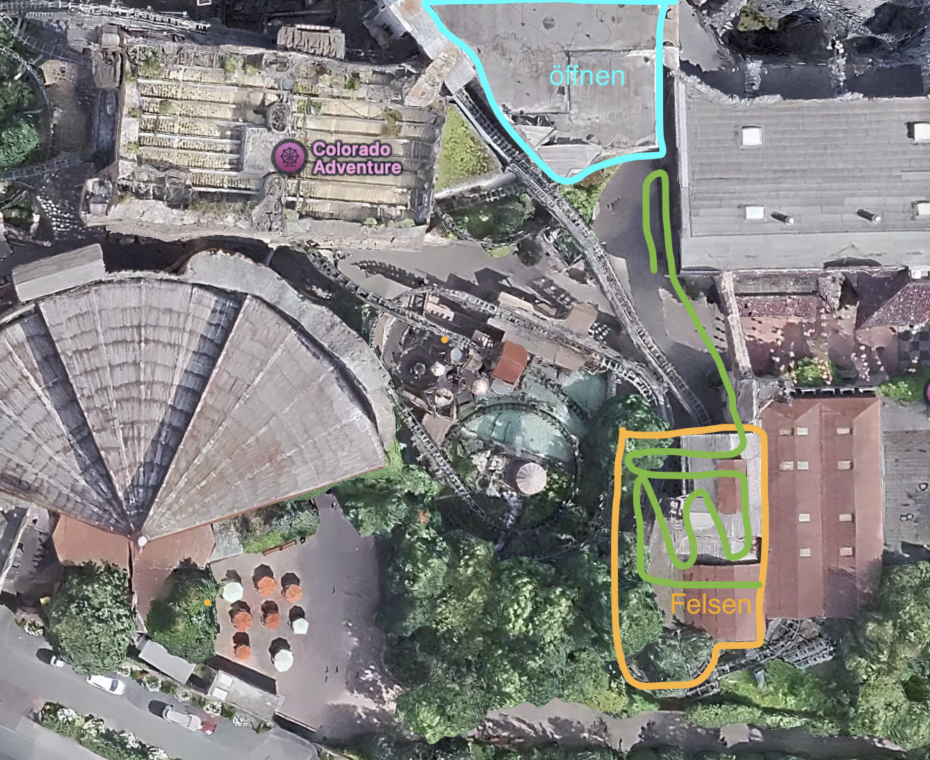 Wäre natürlich auch eine Möglichkeit, die Schlusskurve mit Felsen zu überdachen. Über diesen Felsen und auf dem jetzigen Dach der Station dann den neuen Wartebereich zu legen. Dieser wäre dann länger und hätte mehr Kapazität als jetzt. Vor allem wäre der neue Wartebereich aber ansprechender und besser Thematisiert als jetzt. Die Wellblechhalle öffnen und thematisieren (türkis), neben der Silberminen Halle einen Treppenaufgang schaffen mit Brücke (eingehaust => ohne Sicht auf China), auf das Stationsdach der CA. Dort dann Indoor die eigentliche Warteschlange unterbringen. Treppe nach unten führt dann auf die Station wie sie jetzt ist (grün). Thematisch das ganze in Felsen eingebaut (Organe). Das würde helfen, dass sich Eingang und Ausgang in Mexico befinden und durch das große, neuen Felsmassiv würde auch Mexico immersiver werden. Vor allem wird eine klare Abtrennung zu China erreicht. Die Warteschlange hätte mehr Kapazität als jetzt. Man könnte dann auch Single Rider oder Quickpass dort integrieren. Das nur mal so als Idee.