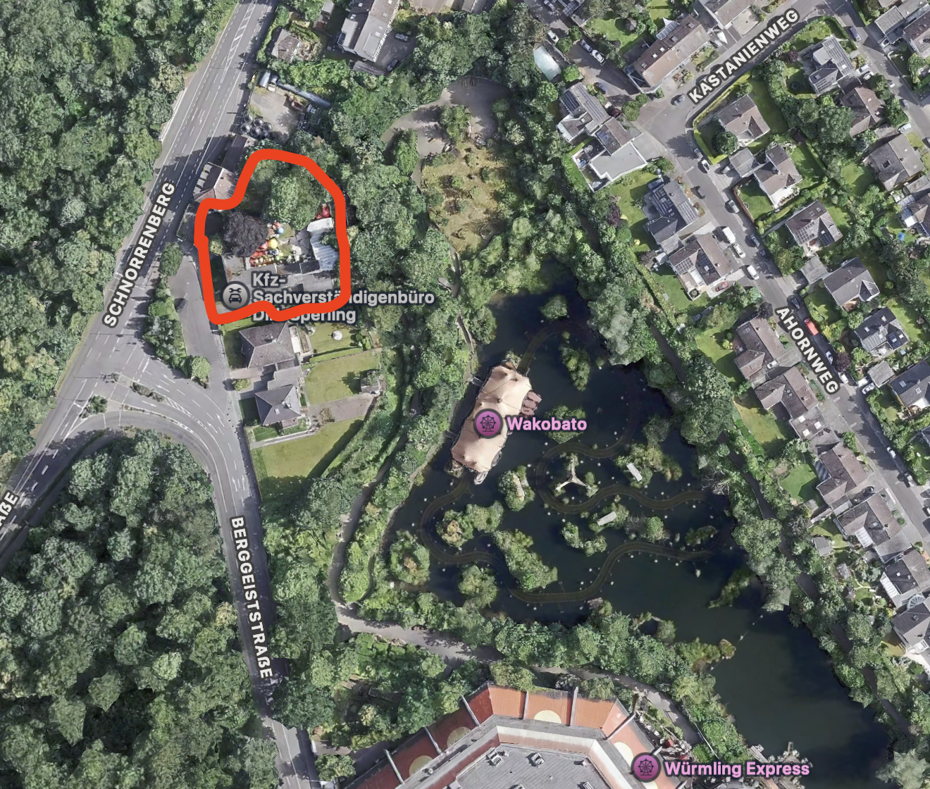 Weiß jemand, was mit diesem Grundstück los ist? Es werden dort ja immer wieder Gegenstände aus dem Park gelagert. Könnte also durchaus sein, dass das Gebäude dem Park gehört. Und es könnte auch sein, dass dort laut Bebauungsplan Gewerbegebiet ist, denn im Nachbargebäude befindet sich dieses KFZ Sachverständigenbüro. Daneben sind diese zwei Einfamilienhäuser mit langweiligem aber gepflegtem Garten. Aber: wenn eine Erweiterung auf dieser Fläche stattfinden würde, dann würde man zunächst dort vermessen - und nicht mit der Rodung der Bäume auf Parkseite beginnen.