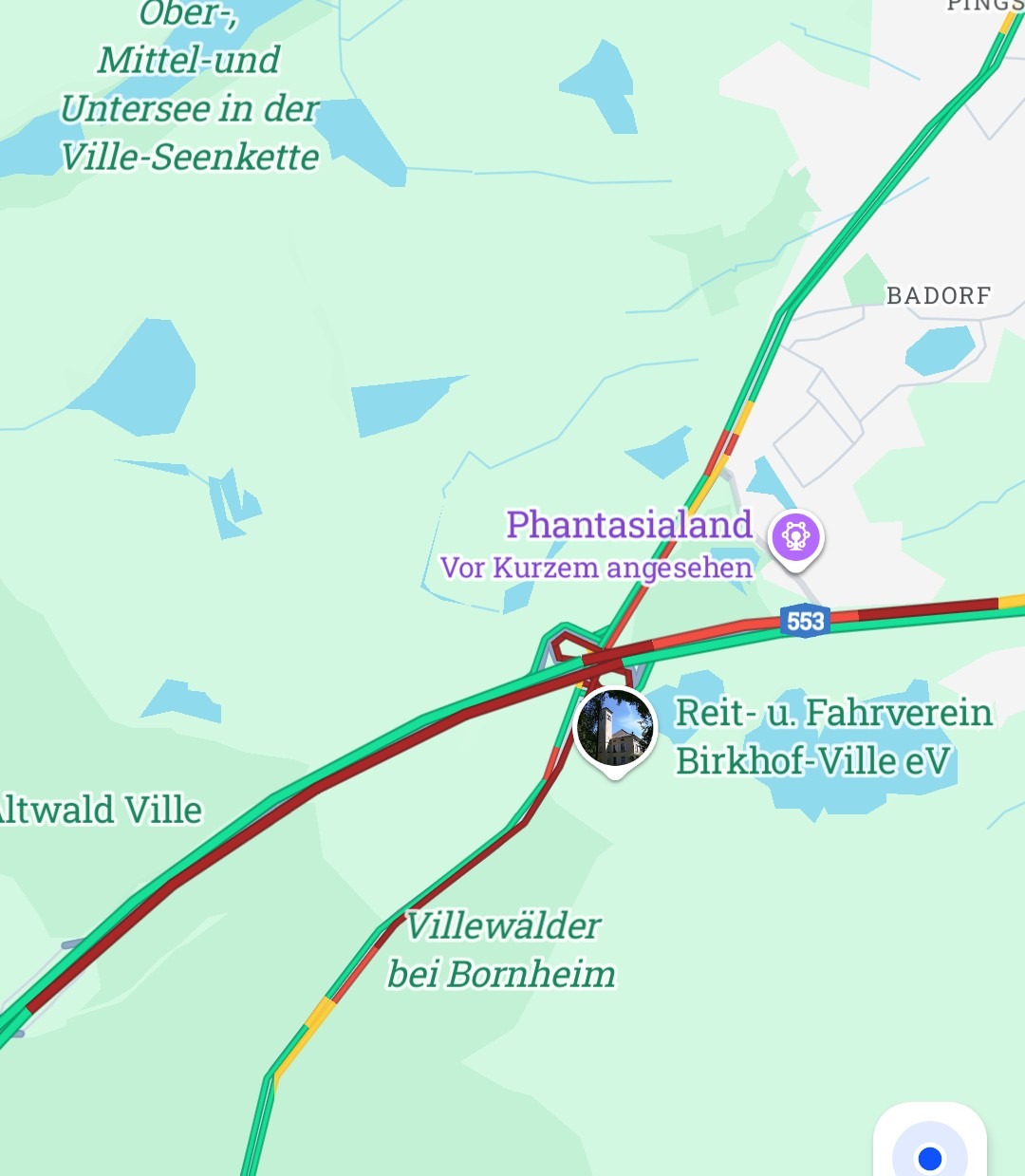 Ob die Ampel so sinnvoll für den Verkehrsfluss ist, kann man hinterfragen. Die Unfallgefahr ist zwar niedriger, aber jetzt staut es sich sogar auf der Phantasialand Straße - da wo vorher fließender Verkehr war. Wenn man den Verkehrsdaten von Google glauben darf, dann sind das etwa 20 Minuten Verzögerung.