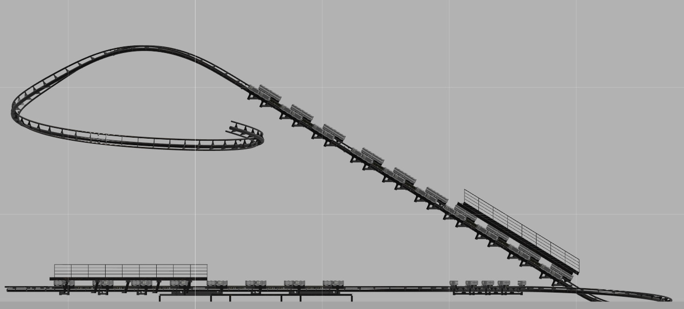 31. Januar 20169 j Autor Und der zweite Streckenabschnitt ist vollendet. Nachdem der Zug auf dem ersten Speed-Up-Hill wieder an Höhe gewinnt, geht die kurvenreiche Fahrt weiter, unterbrochen von einem kleinen Airtime-Hügel. Gegen Ende des Abschnitts gewinnt der Zug an Geschwindigkeit und durchfährt das Kellerniveau der Halle, um nach der Talfahrt in die letzte Beschleunigungsstrecke einzufahren. Die Halle ist nun schon gut mit Schienen gefüllt, aber es ist noch Luft für den kommenden letzten Streckenabschnitt. Unterdessen wurde auch das Modell der Station fertiggestellt. Später wird dieses noch mit Texturen und Beleuchtung versehen.